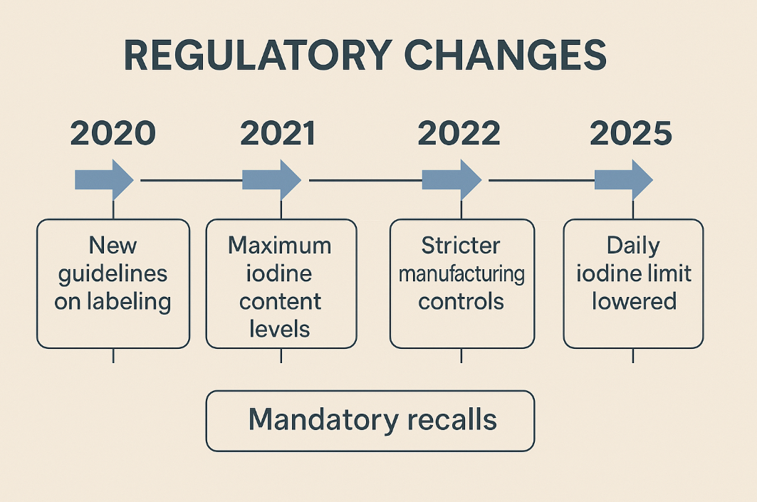 | 2025 | 요오드 UL 100 µg 예고 | DSHEA 개정(예정) | 라벨 정확성 가이드 | Batch-specific test |