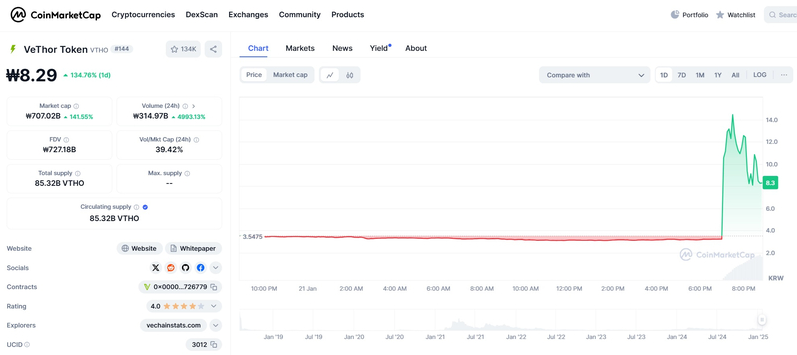 우선 비토르토큰 코인의 차트를 게이트아이오 거래소를 통해서 먼저 간단하게 살펴보려고 합니다. 현재 엄청난 급등이 나와주었는데, 거의 300% 정도 상승해주는 모습을 보여주었습니다. 이는 업비트 상장이라는 호재로 인해서 이러한 모습을 보여주었는데요. 현재 VTHO 코인의 가격은 0.009달러에 거래되고 있습니다.