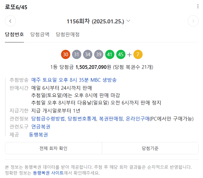 - 1등 당첨번호: 30, 31, 34, 39, 41, 45